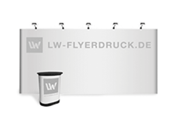 Faltdisplay Comfort gerade - der mobile Messestand Über Jahre hinweg hat sich diese mobile Messewand bereits bewährt und ist das beliebteste unter unseren Messestand-Modellen. Auf dem Weg zum Veranstaltungsort lässt sich dieser mobile Messestand sicher und platzsparend im mitgelieferten Transportkoffer verstauen. Durch die Rollen am Trolley ist ein müheloser Transport zum Standplatz möglich. Dort angekommen lässt ist der Aufbau innerhalb von wenigen Minuten geschafft. Durch Ziehharmonika-System steht das Grundgestellt mit einem Handgriff. Das starke Magnetsystem sorgt für eine stabile Verbindung zwischen den Stangen. Abschließend werden nur noch die Druckbahnen magnetisch mit dem Faltdisplay verbunden. Für den kompetten Aufbau ist kein Werkzeug nötig und keine handwerkliche Erfahrung vorausgesetzt. Der Messestand ist in wenigen Minuten aufgebaut. Lieferdetails Fertig aufgebaut hat die Messewand ein Stellmaß von ca. 417 x 224 x 32 cm. Mitgeliefert werden neben Gittersystem und Druck ein Transportkoffer mit Rollen und zwei Halogenstrahler inklusive Netzteil. Den Druck erhalten Sie in sieben Bahnen - zwei schmale für die Außenseiten und fünf breitere für die Front. Hochwertiges Material und brillanter Druck Das stabile Faltdisplay besteht aus pulverbeschichtetem Aluminium. Der Druck erfolgt auf 400 µm Hart-PVC-Folie mit matter Oberfläche. Das Material ist B1-zertifiziert (schwer entflammbar) und somit für den Einsatz auf Messeveranstaltungen geeignet. Der haarschafte Druck in Fotoqualität kann zudem auf Anfrage um Ihre Corporate-Design-Farben ergänzt werden. Die passenden Messetresen finden Sie hier.