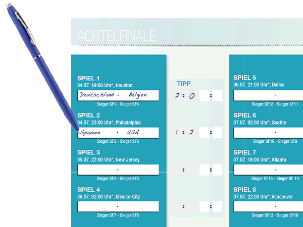 Vom 11. Juni bis zum 19. Juli findet die Fußball WM statt. Genau der richtige Zeitpunkt um Ihren Kunden WM-Spielpläne zur Verfügung zu stellen. Diese Pocket-Planer haben sich in den vergangenen Welt- und Europameisterschaften als echte TOPSELLER herausgestellt. Bei diesen Sportereignissen fiebern nicht nur Fußballfans mit. Die Begeisterung packt jung und alt, männlich und weiblich gleichermaßen - die ganze Nation ist im Fußballfieber. Da darf ein übersichtlicher WM Spielplan natürlich nicht fehlen und zwar von Ihrem Unternehmen.