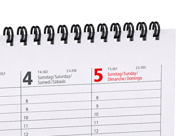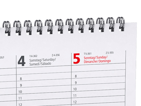 Tischkalender mit verlängerter Rückpappe bedrucken Unseren Tischkalender mit verlängerter Rückpappe bieten Ihnen 365 Tage im Jahr vollen Überblick. Aber nicht nur für Sie, sondern auch für Ihre Kunden eignen sich die Kalender besonders gut, denn so ist Ihr Unternehmen jeden Tag im Blickfeld des Kunden. Unser Tischkalenderangebot: Material Rückpappe: 350 g Bilderdruckpapier matt Material Kalendarium: 70 g Offsetpapier Farbigkeit: 4/0-Farbdruck Druck: Deck- und Rückblatt bedruckbar Formate: 29,7 x 13,5 cm Ausführung: 2 Seiten pro Kalenderwoche (Rückseite: Platz für Notizen) Wire-O Bindung: Schwarz, Weiß oder Silber Kalendarium: Vorgedruckter Kalender in 4 Sprachen D/GB/F/ES Verarbeitung: mit stabiler Rückpappe für einen sicheren Stand Feiertage: Feiertage und Ferien D/AT Auflagen: ab 5 Stück Tischkalender bedruckt mit Ihrem Wunschmotiv ermöglichen einen schnellen und sehr überschaubaren Überblick über alle Termine, Geburtstage, Meetings etc. Durch den individuellen Druck sind Ihre Tischkalender als Aufsteller garantiert ein Hingucker der viele Vorteile mit sich bringt. Ein Allrounder quasi, denn Tischkalender finden nicht nur im gewerblichen Bereich ihre Anwendung, auch in privaten Haushalten sind sie ein praktischer Alltagshelfer. Um Ihren einzigartigen Tischkalender als Aufsteller noch individueller zu gestalten, haben Sie die Wahl zwischen den verschiedenen Spiralfarben schwarz, weiß oder silber. Individuell gestaltete Tischkalender mit verlängerter Rückpappe drucken lassen Unsere Tischkalender mit verlängerter Rückpappe können auf dem Deckblatt und der Rückpappe invidviduell bedruckt werden. Zudem können Sie zwischen 3 verschiedenen Farben der Wire-O Bindung wählen. Das Kalendarium ist bereits vorgedruckt.